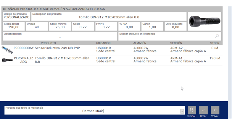 Botón Añadir. Añade un producto a la lista de material. Este comando no modifica el stock.