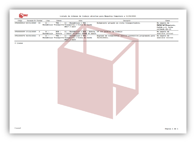 - OT. Orden de trabajo asociada a la acción. Este listado es solo una agenda, que indica qué tareas