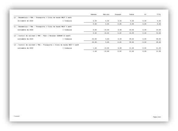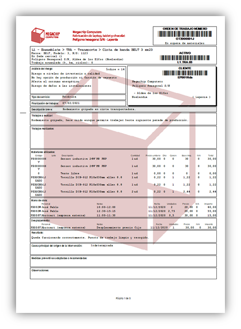 - Gestión de órdenes de trabajo (OT), mano de obra, desplazamiento y material utilizado.
