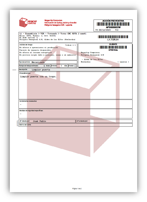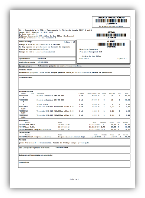 - Clientes, línea, sistema, Activo. Datos del activo sobre el que se debe realizar el trabajo.
