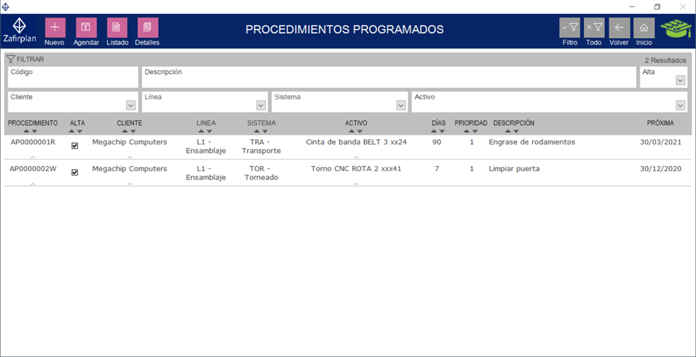 Cada procedimiento programado actúa como una plantilla para generar una OT, además de la información para